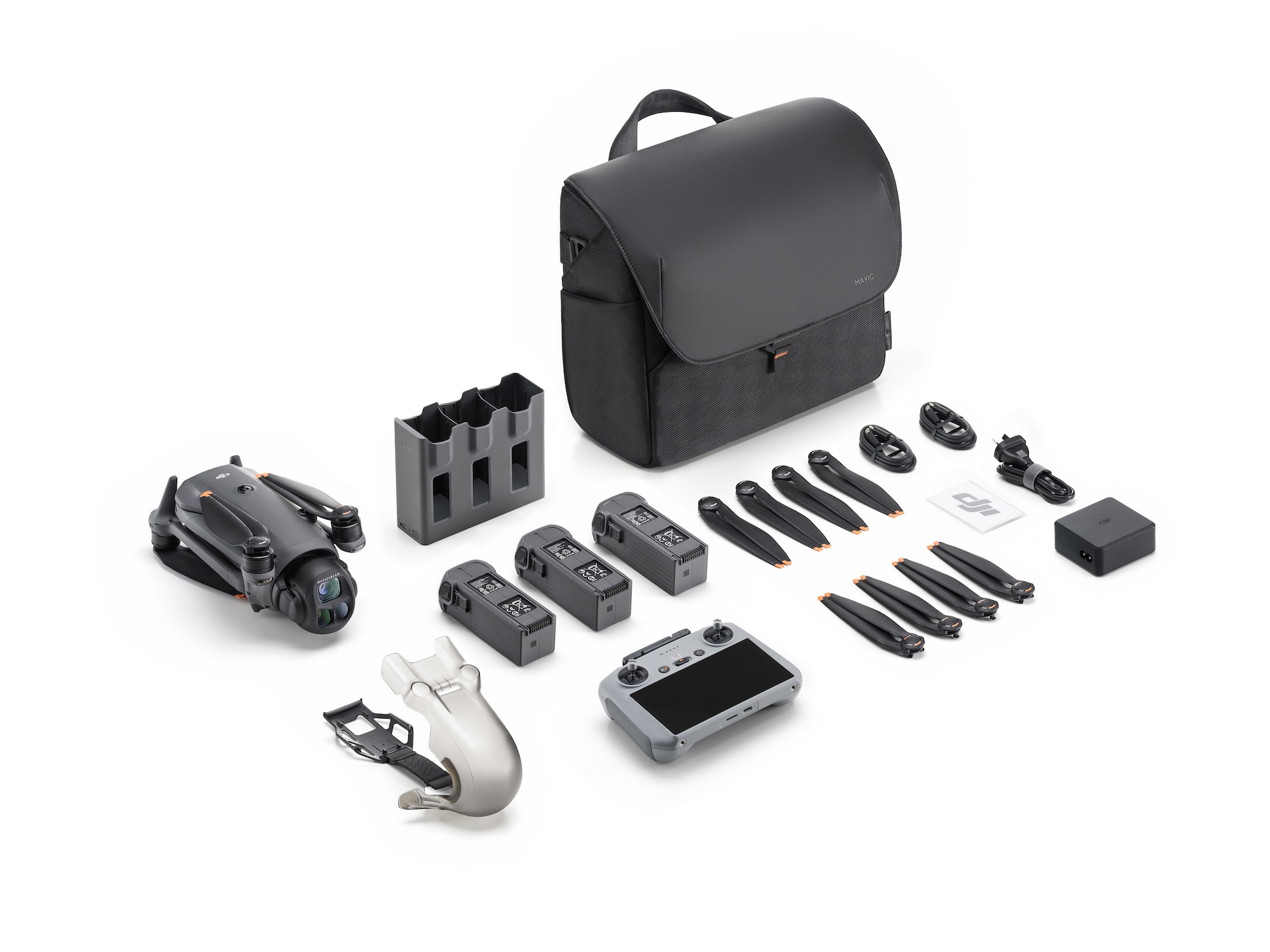 Obsahuje vstavané 512GB SSD úložisko, diaľkový ovládač DJI RC Pro 2 so 7-palcovým extra jasným Mini-LED displejom, 240W napájací adaptér, USB-C ↔ USB-C vysokorýchlostný dátový kábel, dve prídavné batérie, paralelný nabíjací hub, ramennú tašku a ďalšie – všetko v jednom balení.