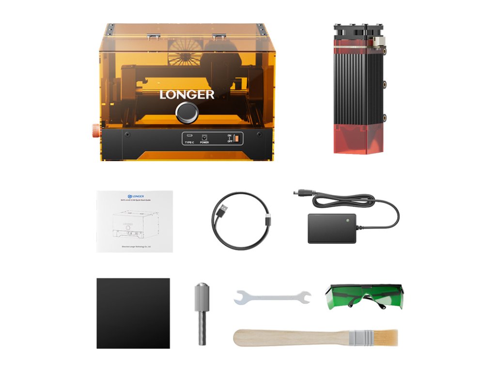 Hliníkové telo s hmotnosťou 2,89 kg a rozmermi 307 × 320 × 197 mm umožňuje jednoduché umiestnenie zariadenia na stôl alebo presun medzi pracoviskami. Predmontáž znamená, že po pripojení napájacieho zdroja a dátového kábla môžete ihneď začať s vaším prvým projektom. Sada obsahuje ochranné okuliare, zaostrovací blok, náradie a príslušenstvo potrebné na začatie práce, takže nemusíte kupovať vybavenie samostatne. To je obzvlášť výhodné, ak s lasermi práve začínate.
